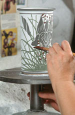 All the designs are made with free hand brushwork using metallic oxides and sgraffito. Sgraffito is a process where the design is scratched through the surface oxide to the glaze underneath. Our pieces, from a cup to the largest vase, are one of kind items because each is thrown and decorated by hand. Since all pieces are individually made, the shapes and patterns have evolved over the years. We believe it is our commitment to continue to resist stamps, molds, and decals, that has resulted the continuing collectibility of our work. Our stoneware pottery is dishwasher, microwave, and food safe.